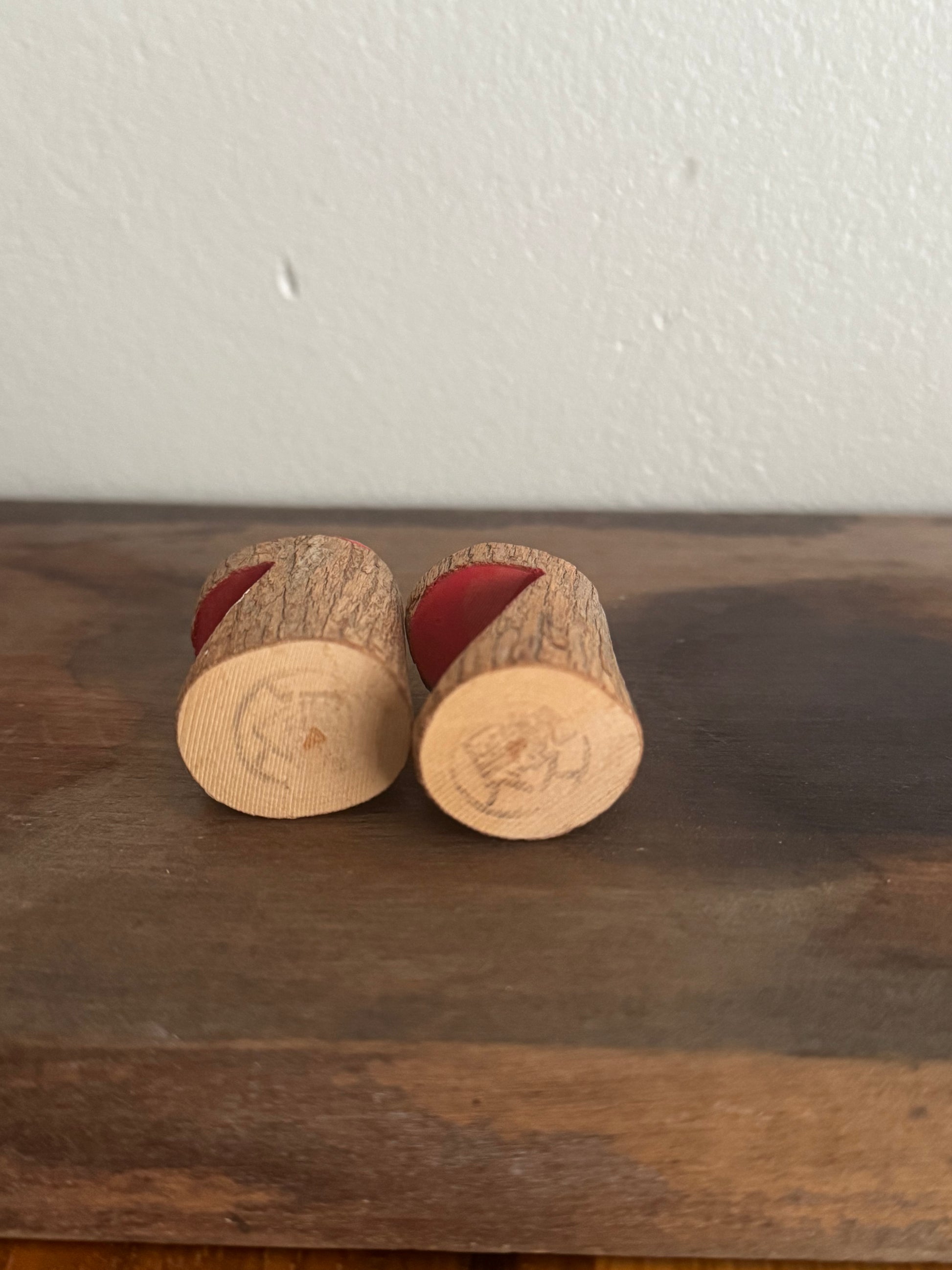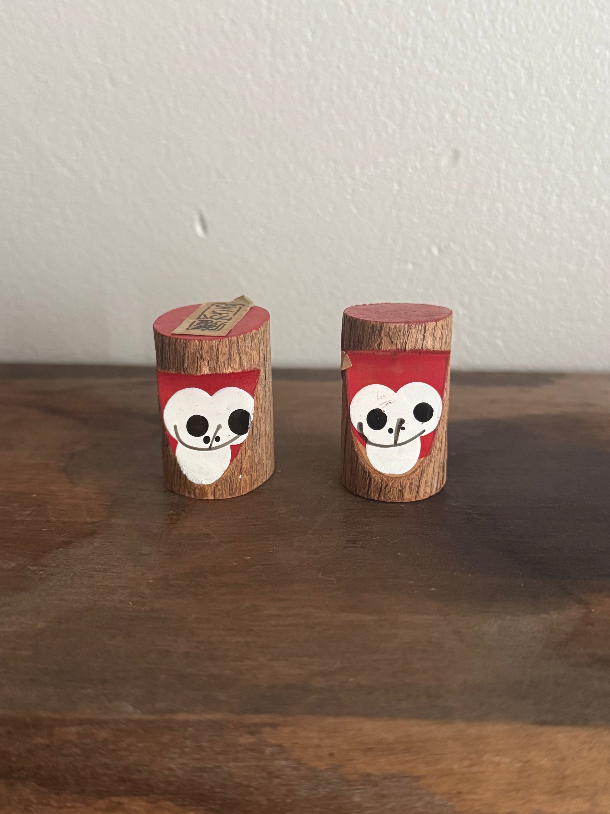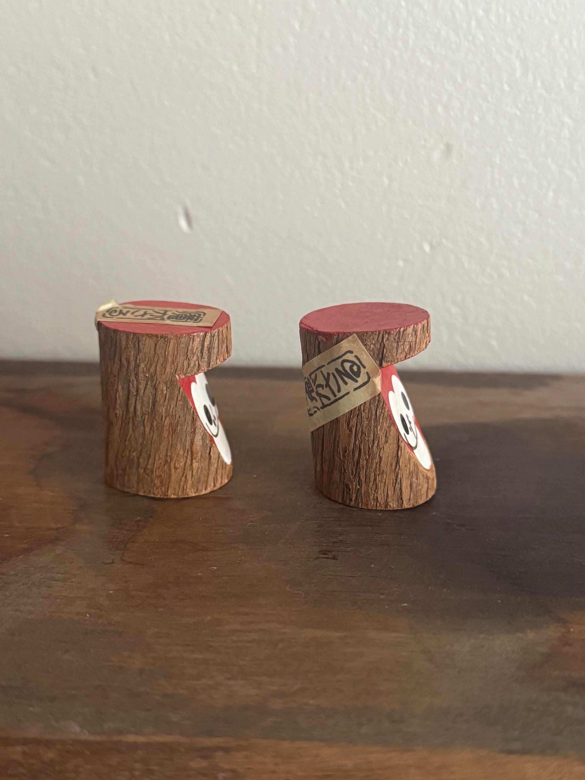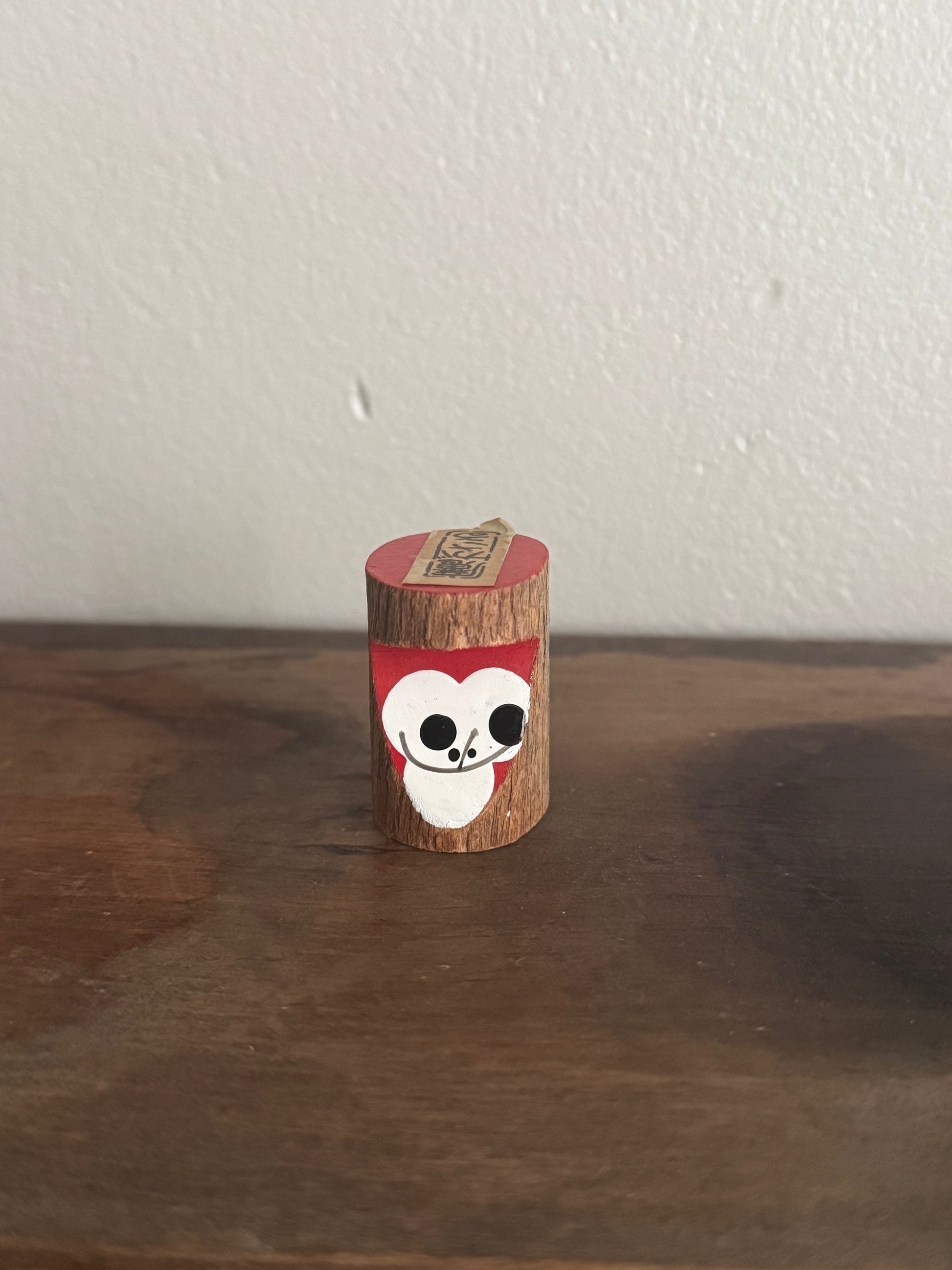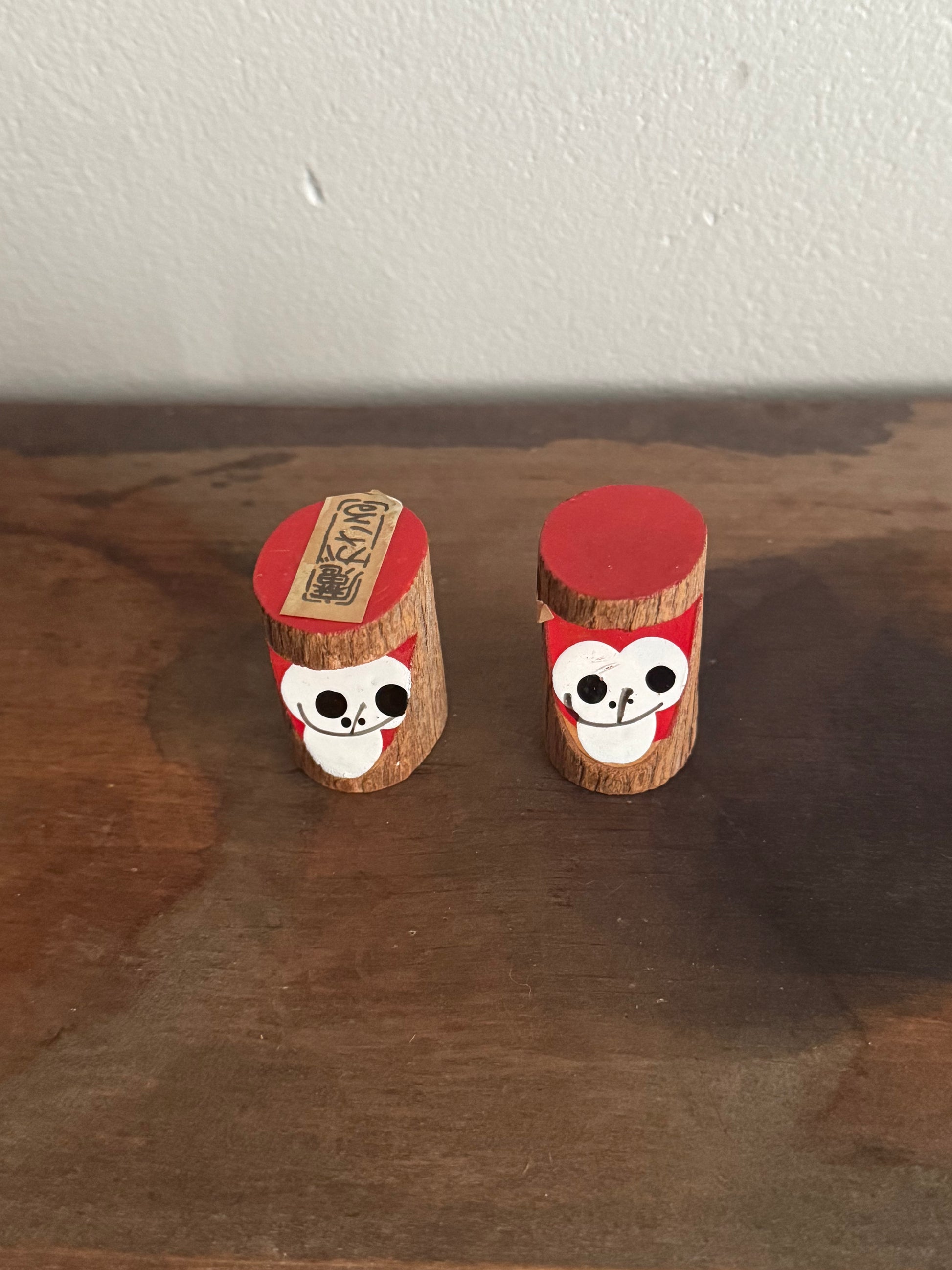 Un petit singe issu de l’art populaire de Takasakiyama, dans la préfecture d’Ōita. Taillé dans un fragment de bois d’environ 3 cm, seul le visage est sculpté, donnant naissance à une figurine d’une grande simplicité et d’un charme touchant. Chaque singe possède une expression différente ; en les disposant autrement, le regard porté sur eux change et l’on ne se lasse pas de les contempler. Un autocollant portant l’inscription « Ma ga saru » évoque sa fonction de talisman protecteur, traditionnellement destiné à éloigner le mal. La base porte la mention « Kokkan Bus », ce qui laisse penser qu’il s’agissait d’un objet souvenir lié à une compagnie de bus touristique de Kyūshū. Une petite pièce empreinte de douceur, où se mêlent artisanat, superstition bienveillante et souvenirs de voyage.