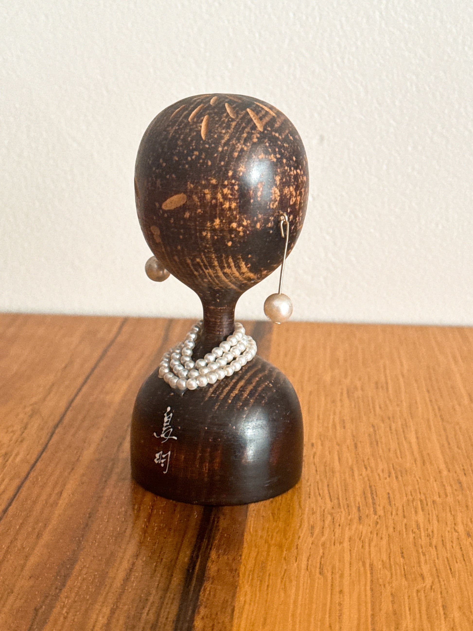 Cette kokeshi créative provient de Toba, ville connue pour ses perles. Elle est ornée d’un motif rappelant la perle, en hommage à cette région emblématique (il ne s’agit pas de véritables perles). Les petits ornements qui se balancent doucement captent la lumière et apportent une touche délicate et élégante. Une pièce charmante, où l’atmosphère maritime de Toba et la sensibilité artisanale se rencontrent avec douceur.