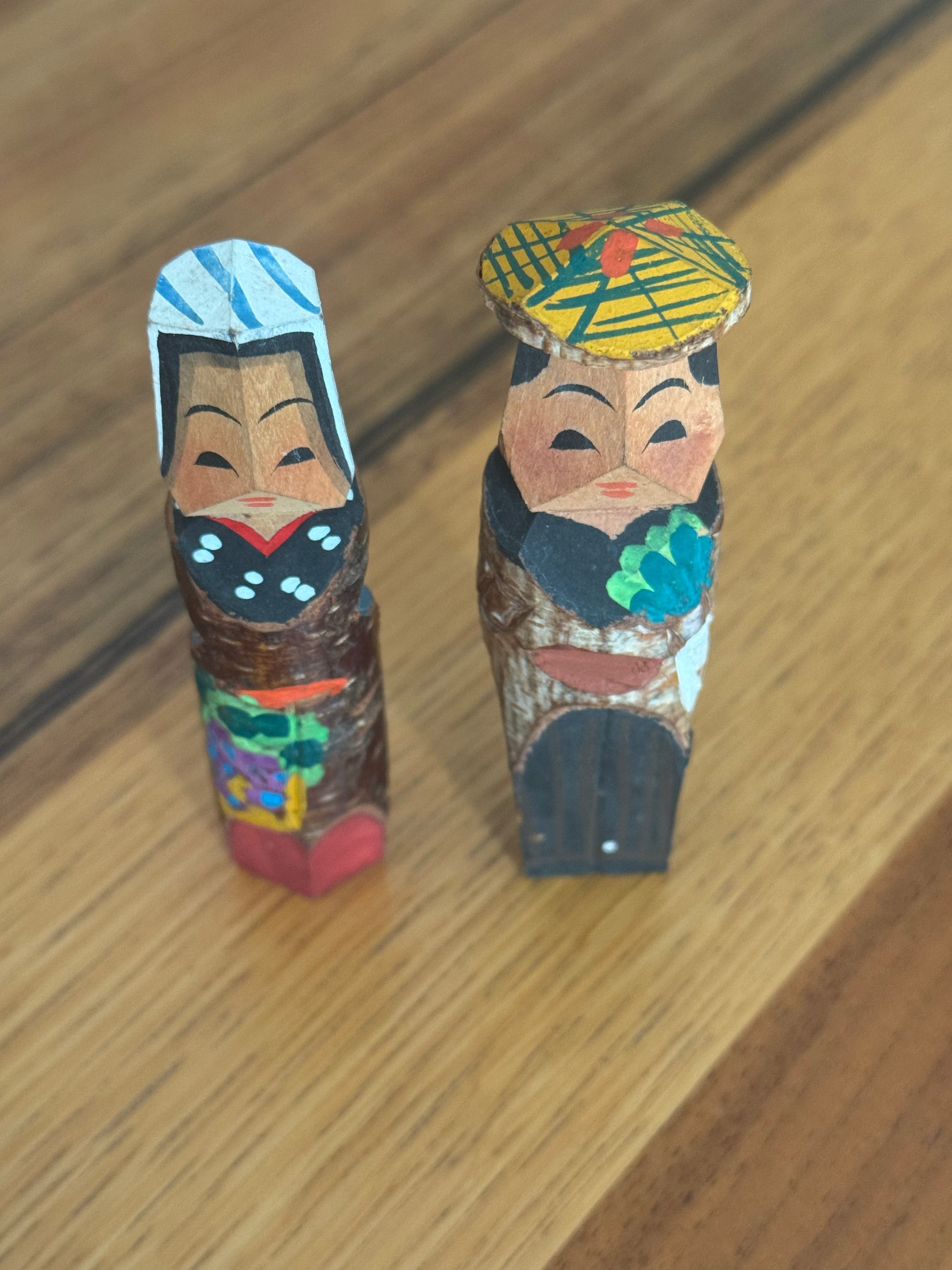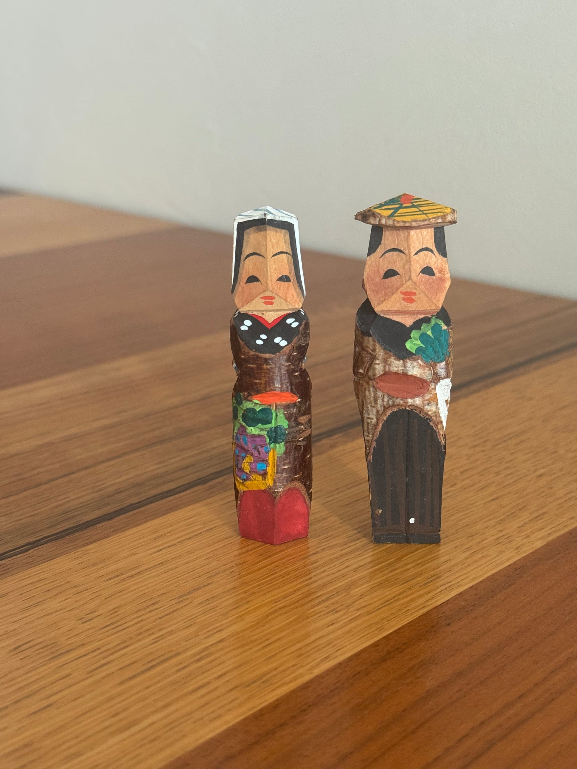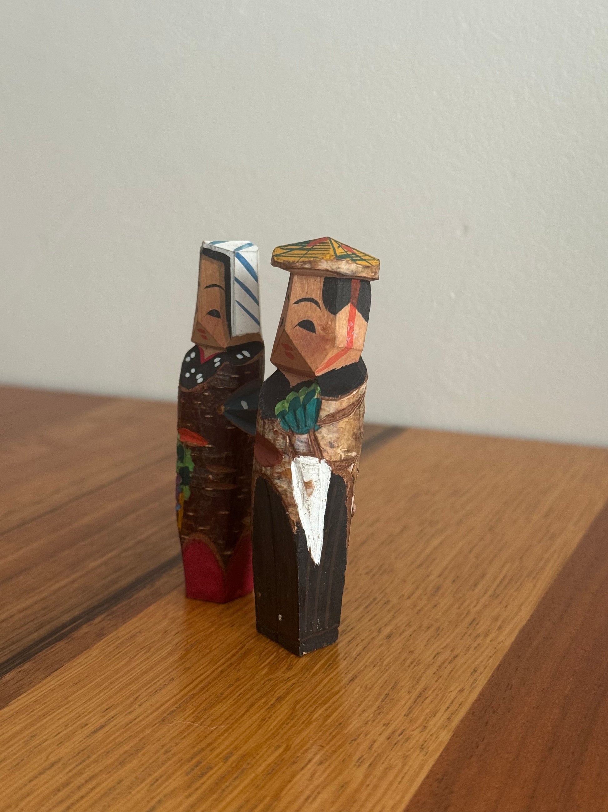 Né dans le mouvement de l’art paysan du début du XXᵉ siècle à Nagano, l’art « paysan » cherchait à révéler la beauté présente dans la vie quotidienne des agriculteurs, en la traduisant en sculptures et en peintures. Ces figurines « koppa », taillées dans de simples chutes de bois, en sont l’un des symboles les plus attachants : de petites œuvres où se mêlent la mémoire d’une époque et la douceur du geste artisanal. Cette paire représente avec une grande simplicité une scène de la vie rurale. Le personnage tenant un daikon, son attitude et son expression silencieuse transforment un moment ordinaire en véritable poésie — une manière pour l’art paysan d’élever la vie quotidienne au rang d’art. Dans ces fragments de bois se concentrent la grâce discrète du folklore japonais et le charme intemporel de la création naïve.
