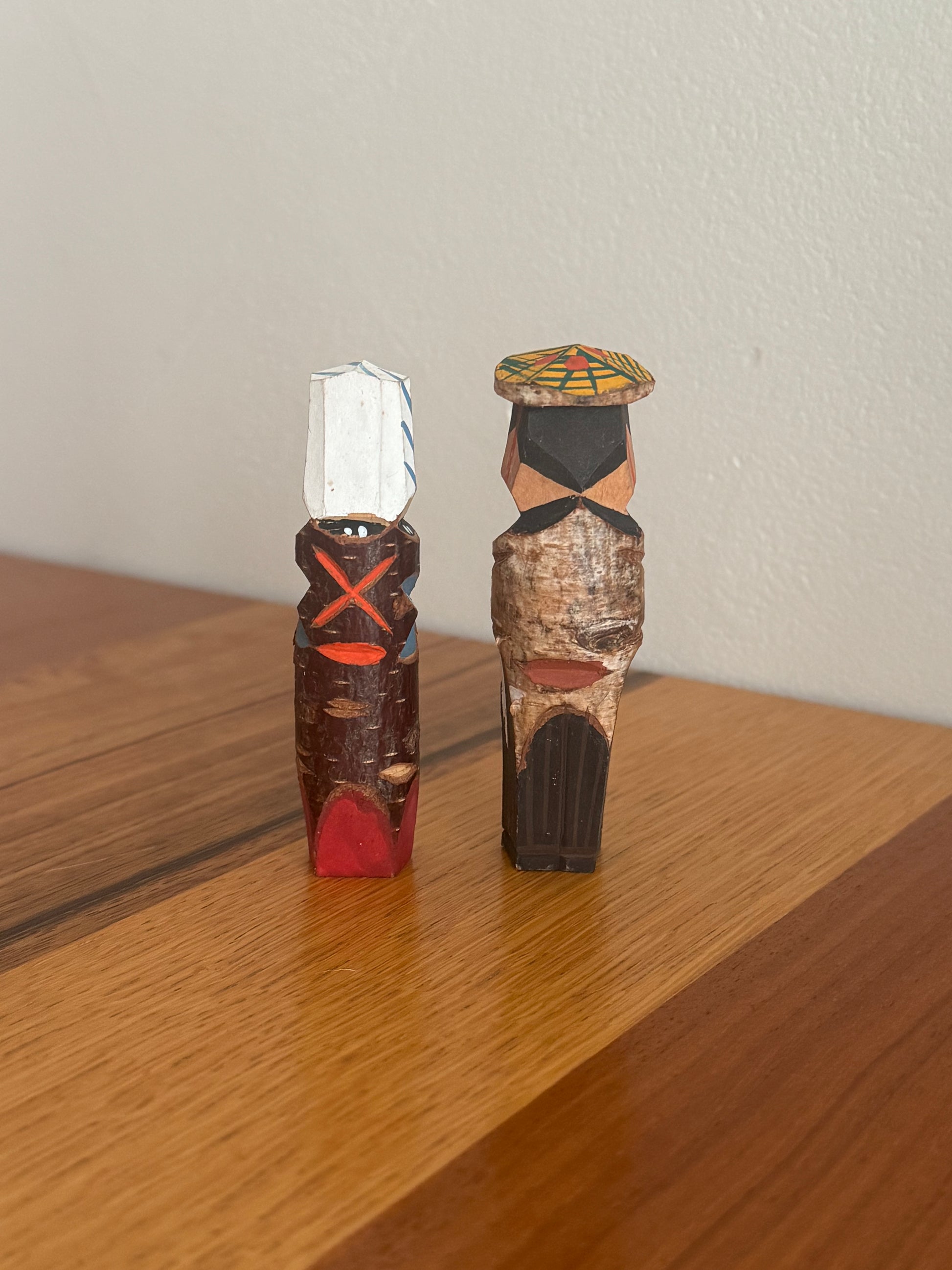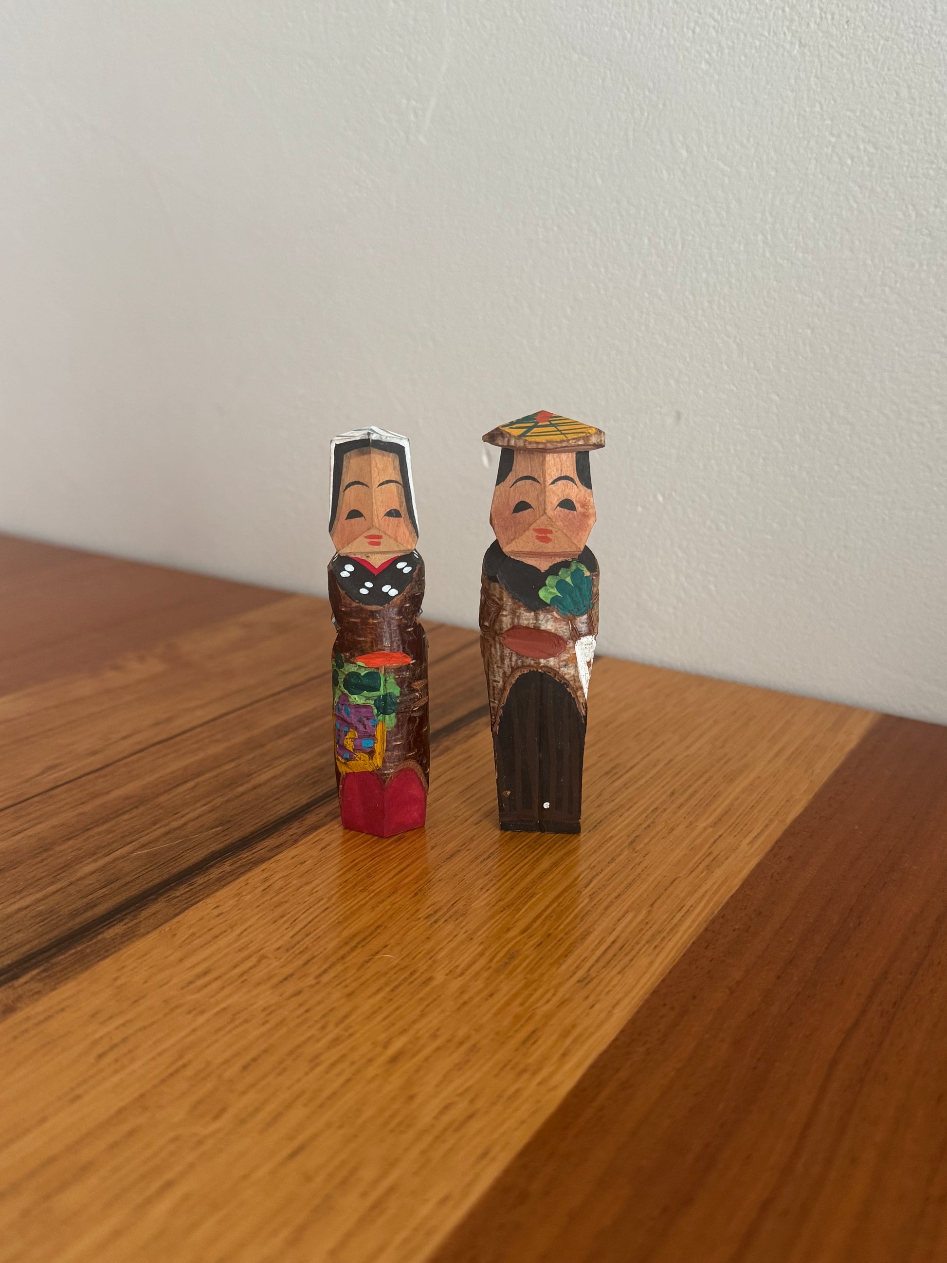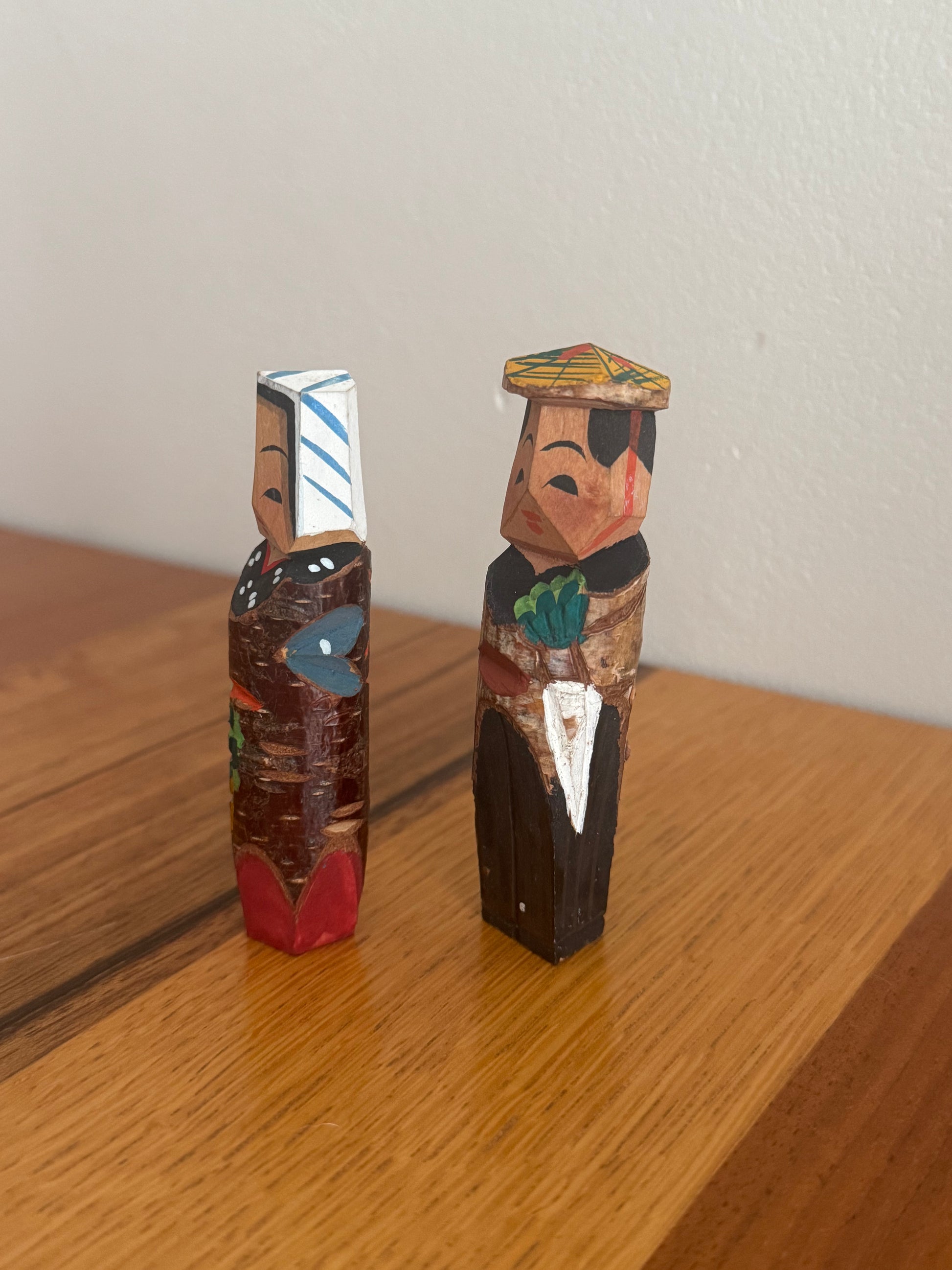 Né dans le mouvement de l’art paysan du début du XXᵉ siècle à Nagano, l’art « paysan » cherchait à révéler la beauté présente dans la vie quotidienne des agriculteurs, en la traduisant en sculptures et en peintures. Ces figurines « koppa », taillées dans de simples chutes de bois, en sont l’un des symboles les plus attachants : de petites œuvres où se mêlent la mémoire d’une époque et la douceur du geste artisanal. Cette paire représente avec une grande simplicité une scène de la vie rurale. Le personnage tenant un daikon, son attitude et son expression silencieuse transforment un moment ordinaire en véritable poésie — une manière pour l’art paysan d’élever la vie quotidienne au rang d’art. Dans ces fragments de bois se concentrent la grâce discrète du folklore japonais et le charme intemporel de la création naïve.