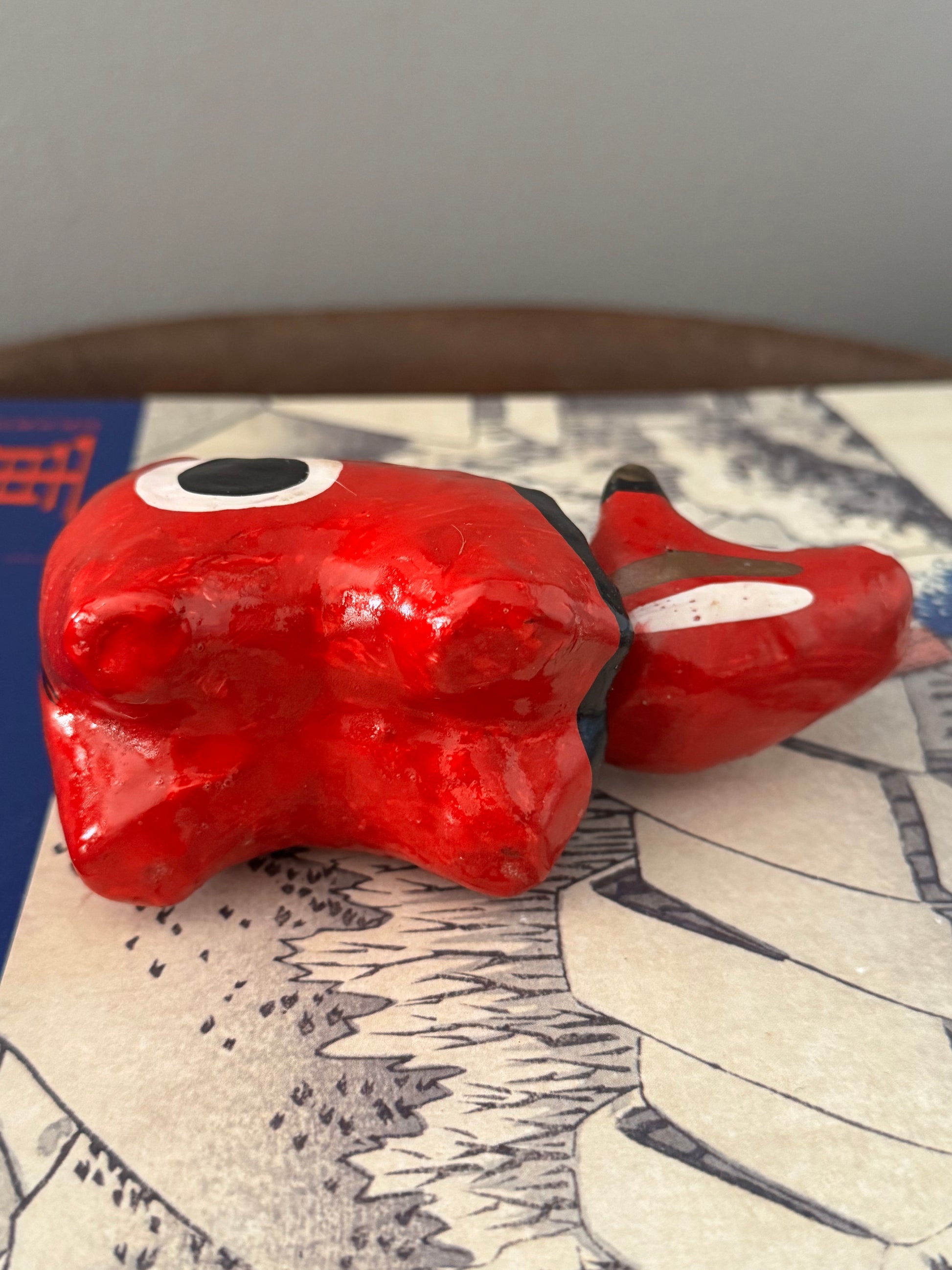 Cette figurine en papier mâché, au design arrondi et au cou oscillant, est particulièrement adorable. Les taches noires sur le corps de la vache représentent la variole, une maladie infectieuse qui a fait rage à l’époque d’Edo et était redoutée, notamment chez les jeunes enfants.