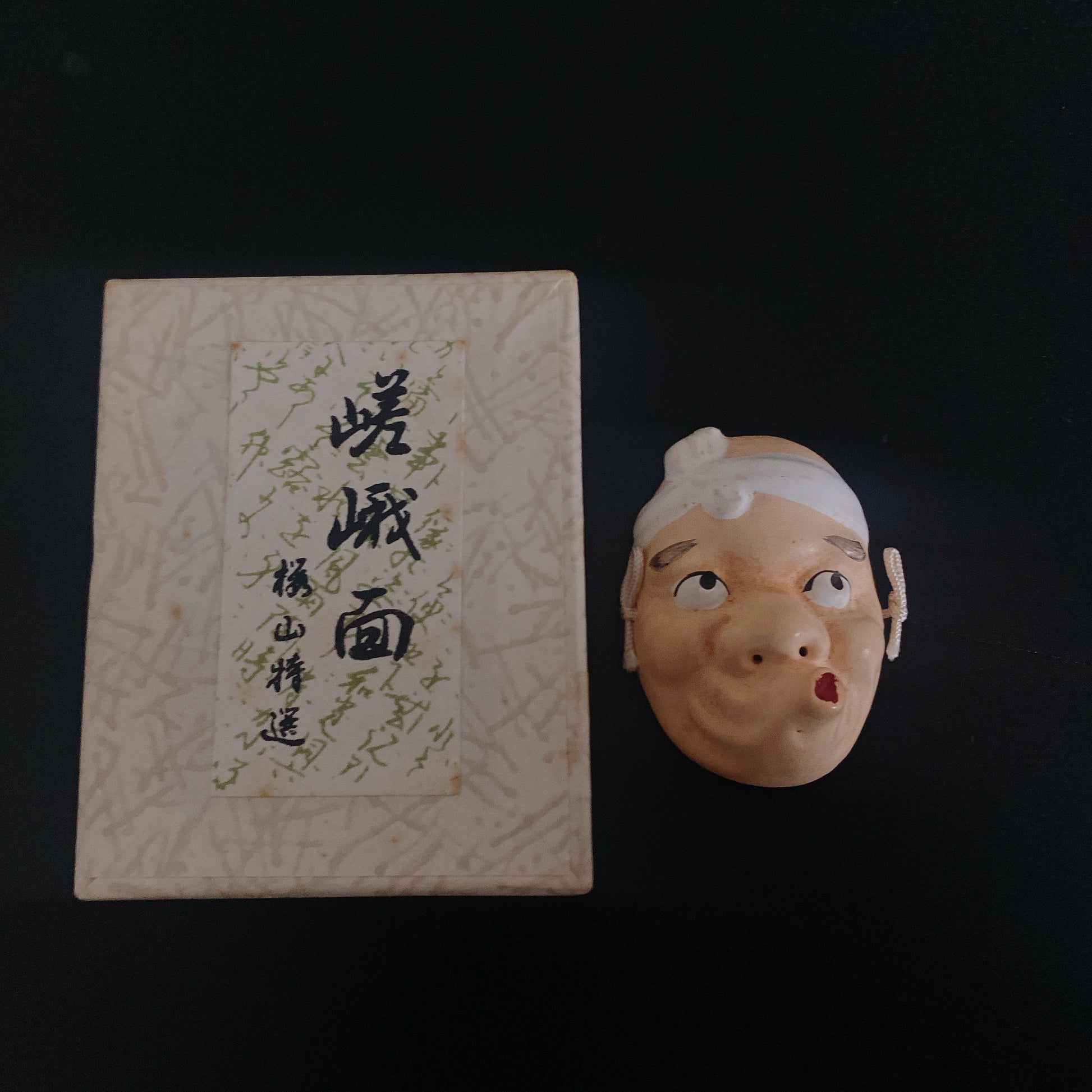 un masque en céramique appelé Saga-men, un artisanat transmis à Kyoto, réputé pour apporter la longévité. Depuis l'antiquité, les Saga-men sont considérés comme des talismans contre les maléfices et les démons, et sont censés apporter diverses autres bénédictions.