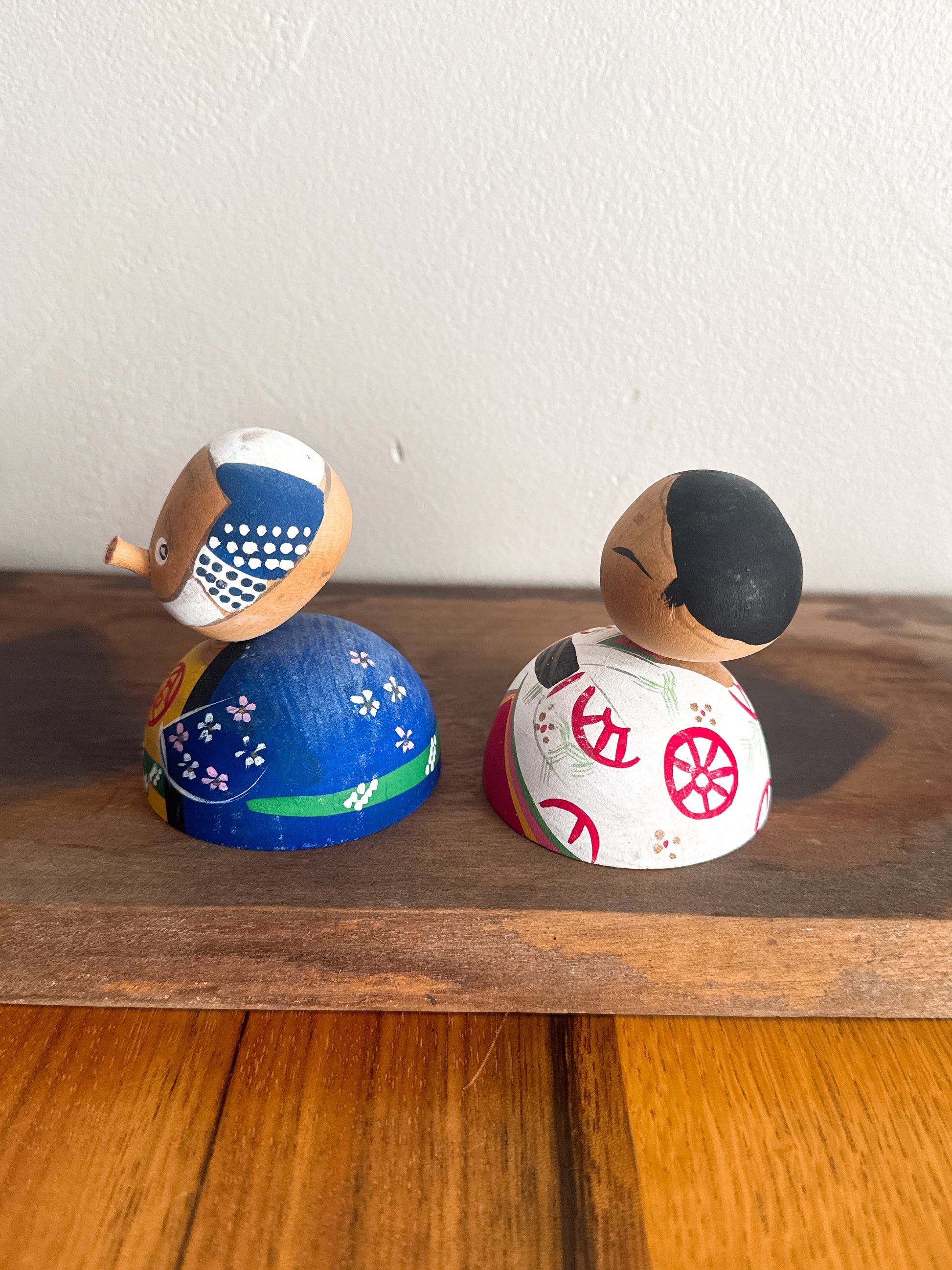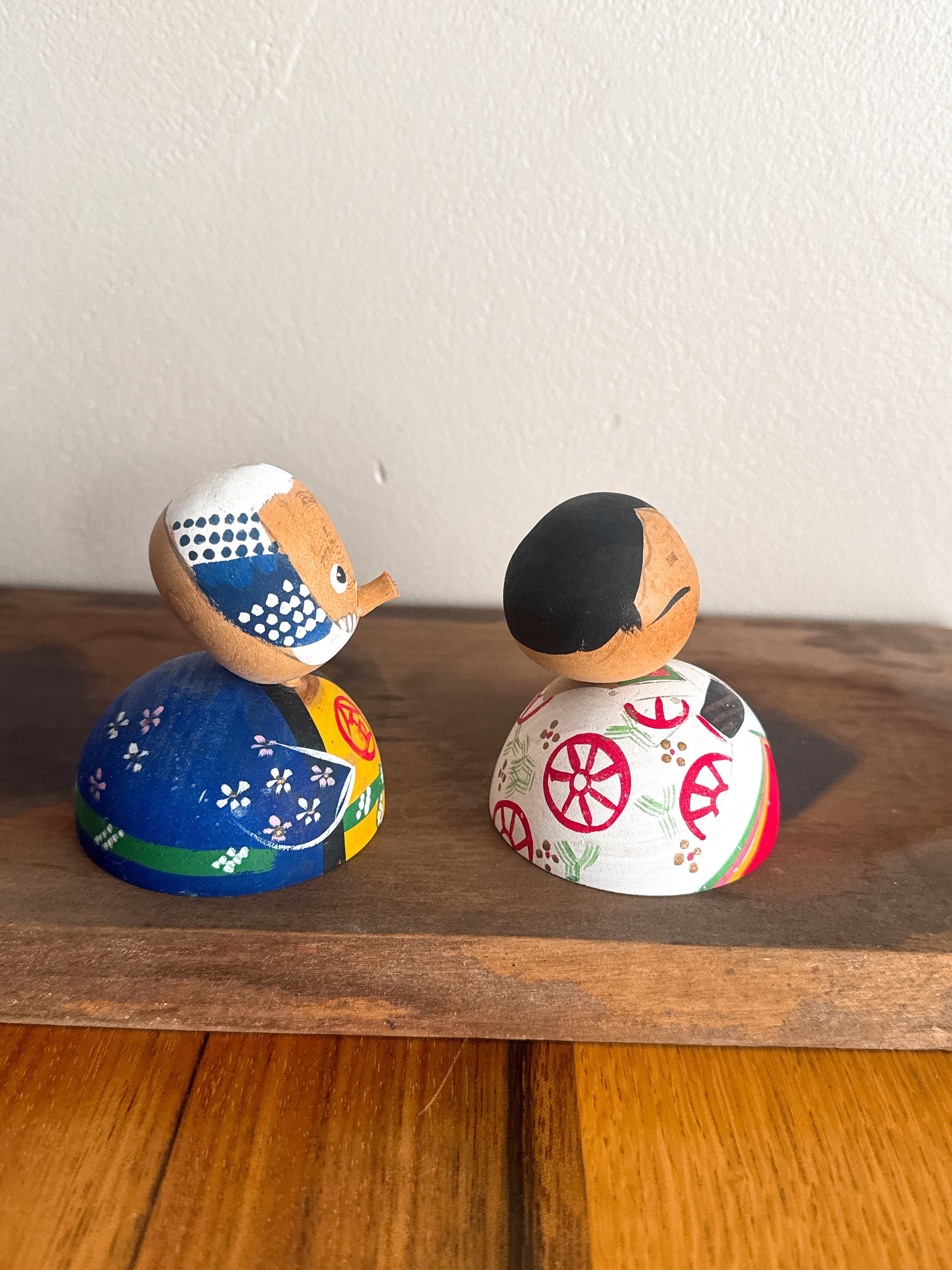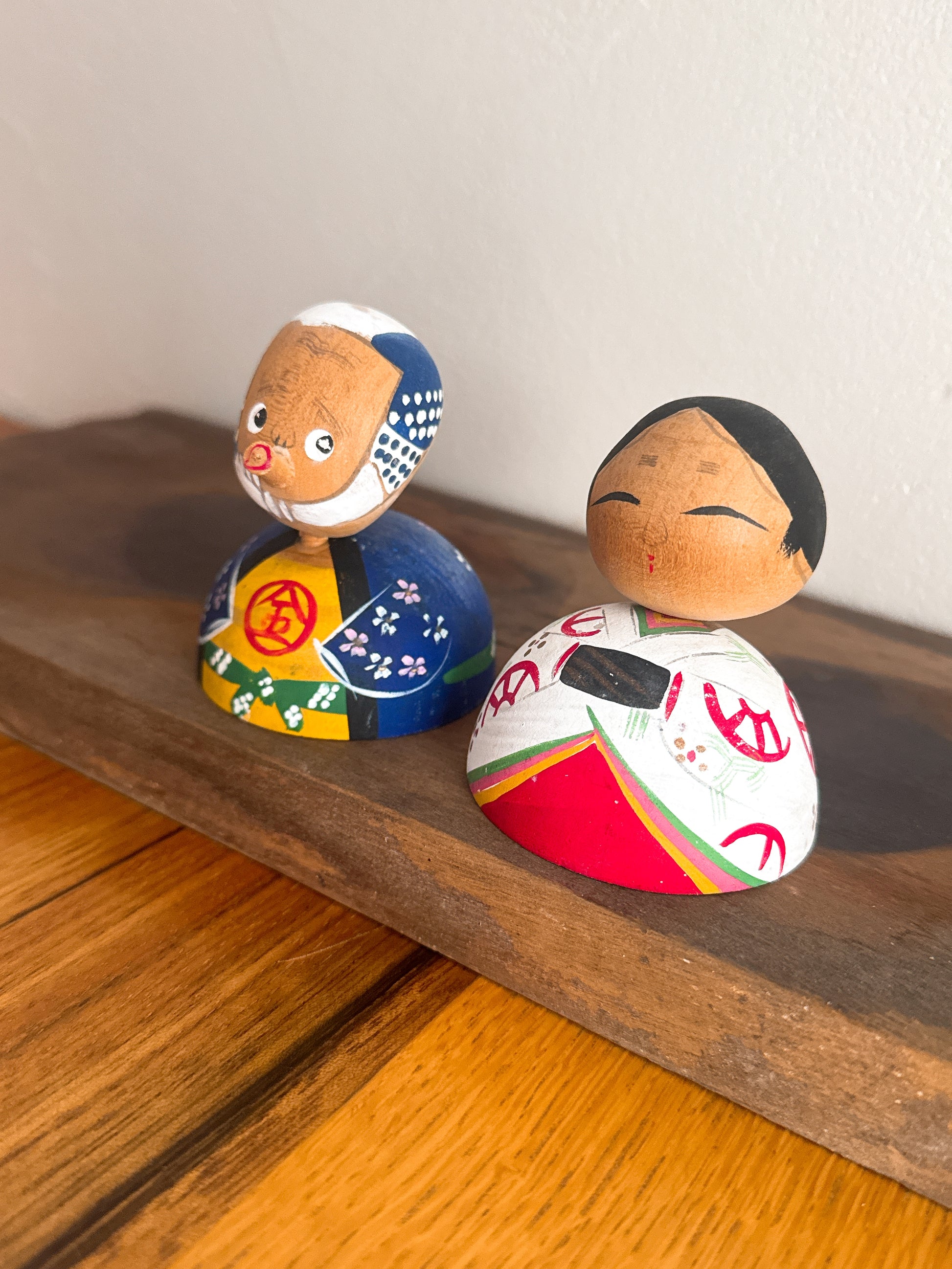 Une paire de kokeshi pleine de charme et d’expressivité : l’une, au visage malicieux rappelant le personnage traditionnel Hyottoko ; l’autre, souriante avec douceur à ses côtés. Ce contraste crée une scène tendre et amusante, typique de l’art populaire japonais.