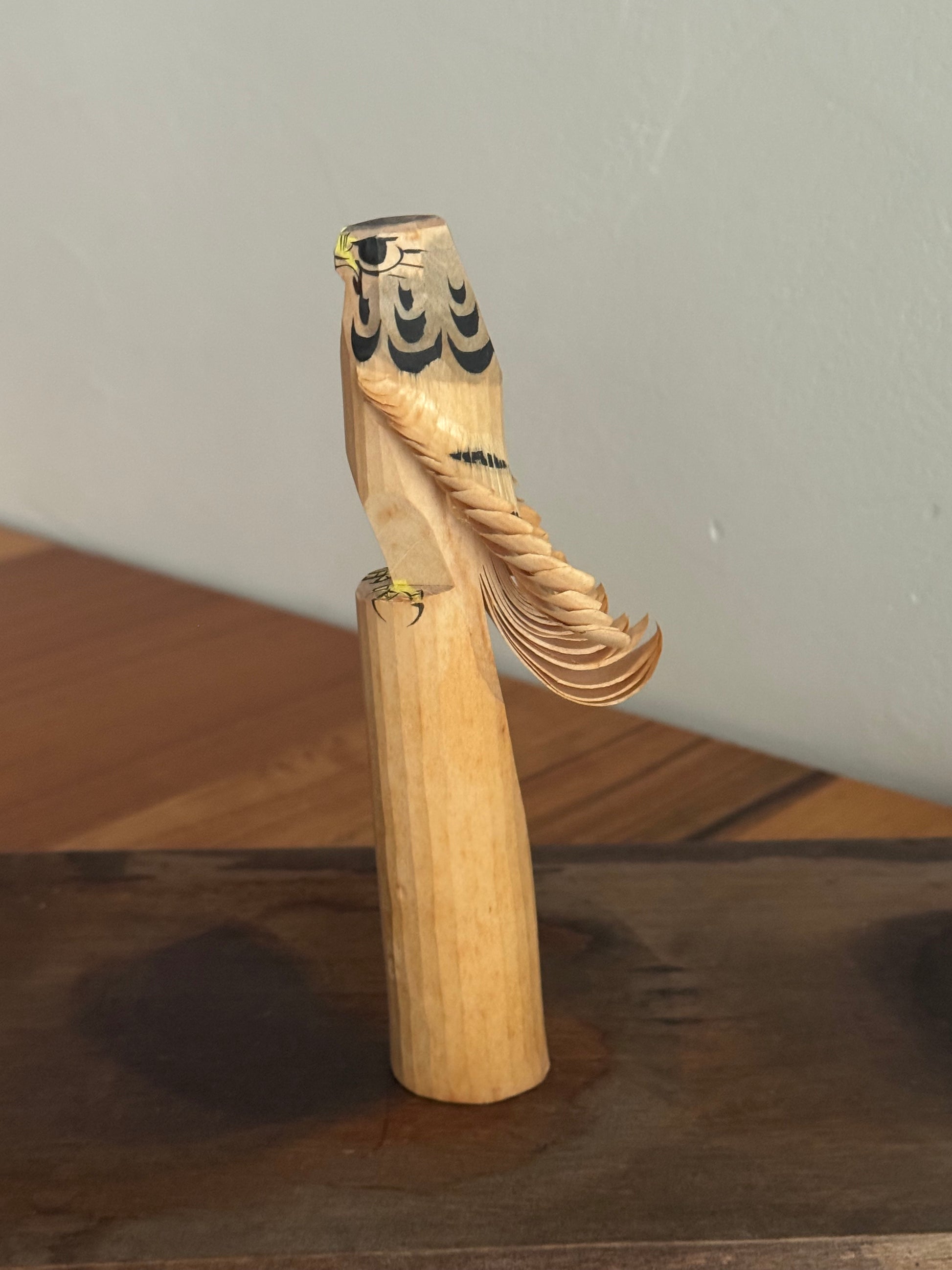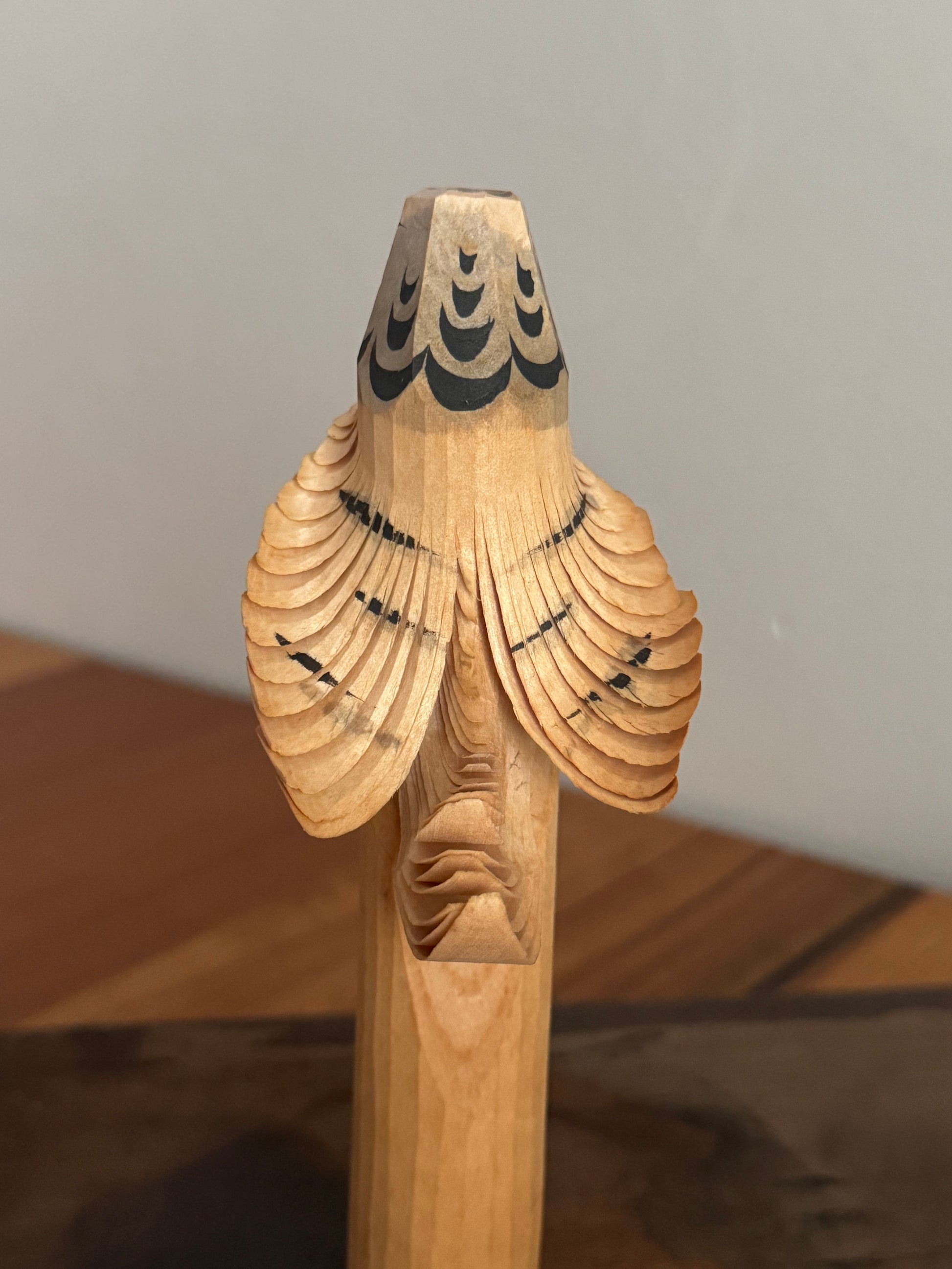 Sculptée à la main dans un bois tendre, puis peinte dans des couleurs vives et traditionnelles telles que le rouge, le jaune et le vert, cette œuvre symbolise la protection, la réussite et la prospérité. Le mot affectueux « poppo », utilisé localement pour désigner un oiseau, ajoute une touche de tendresse à cette pièce pleine de caractère.