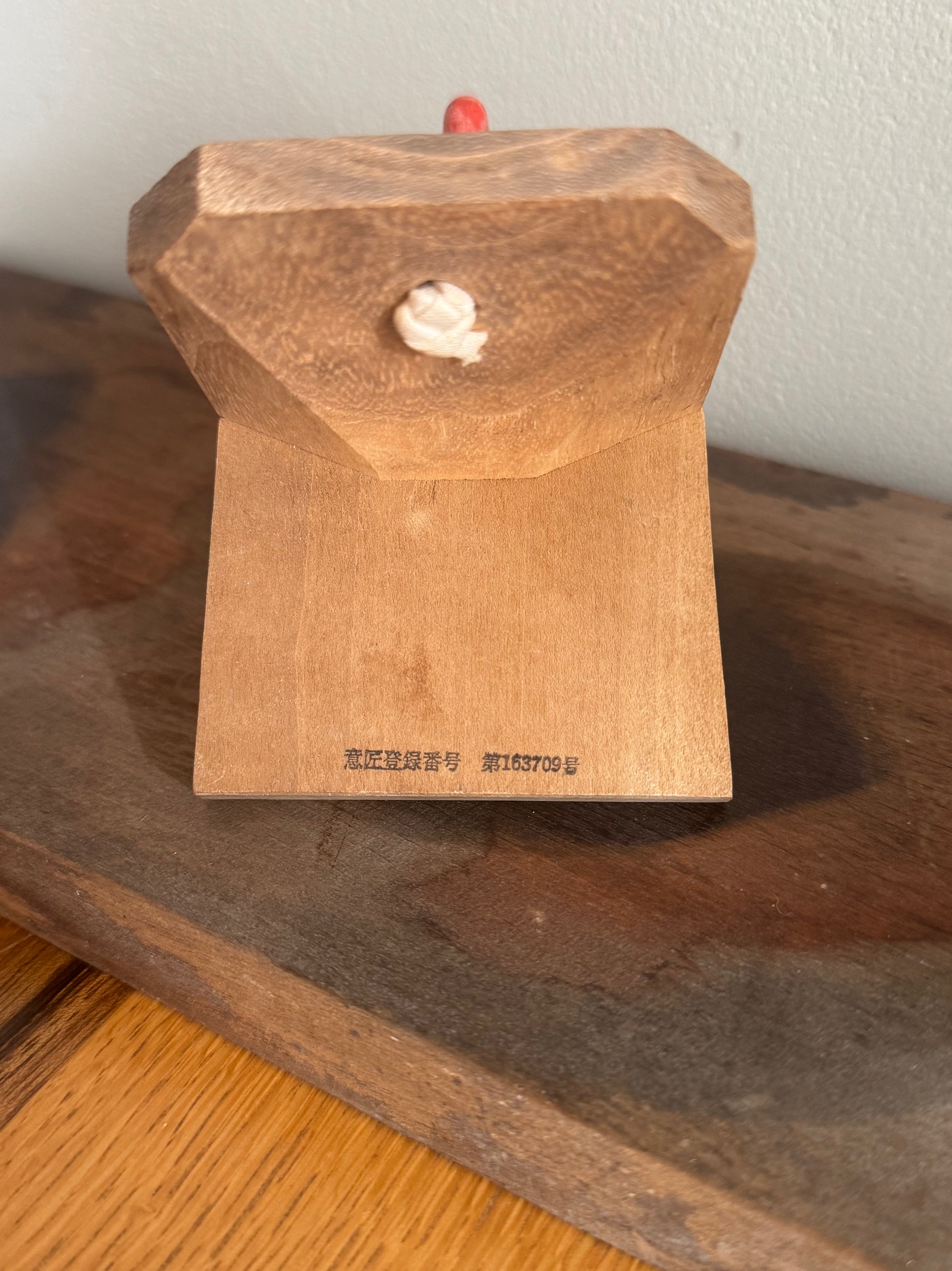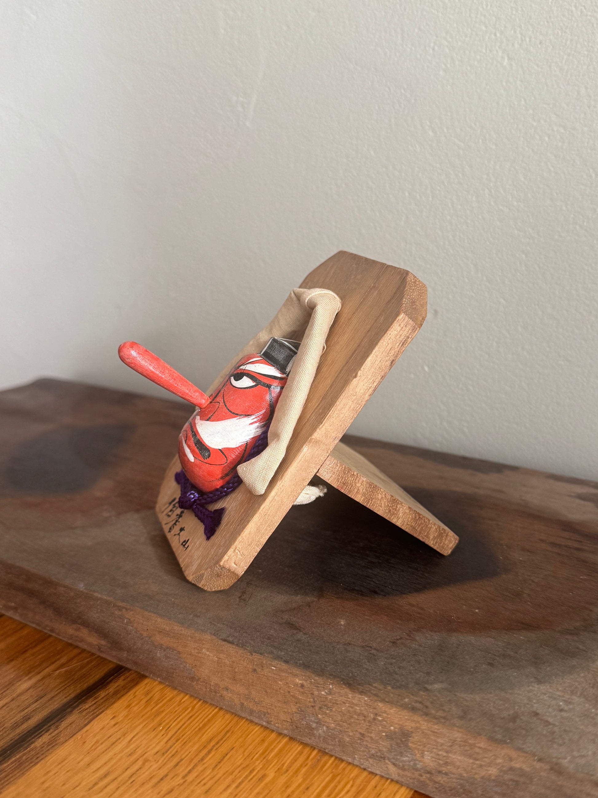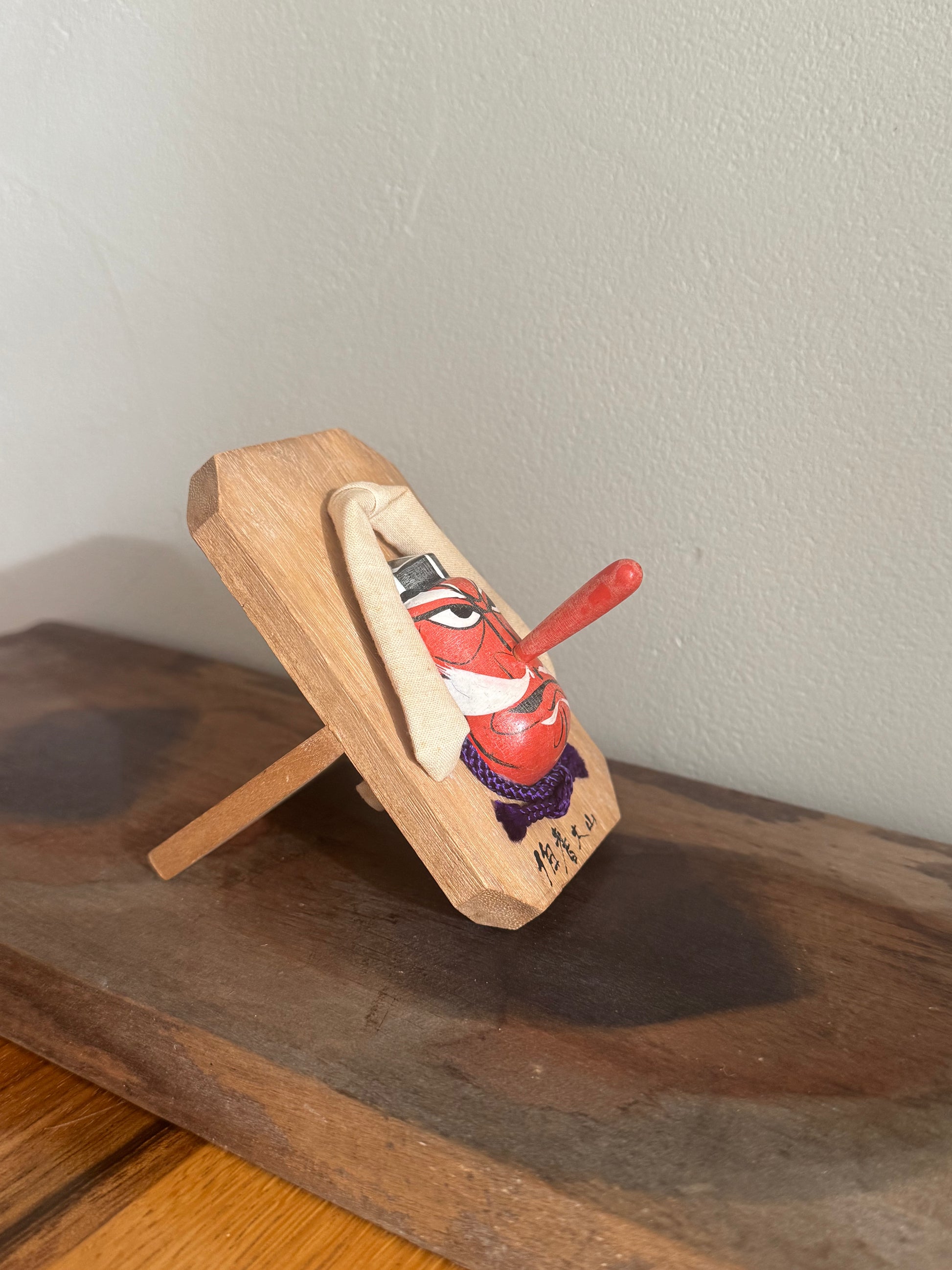 Voici une paire de geta en bois représentant un Tengu, créature mythique japonaise vivant dans les montagnes.