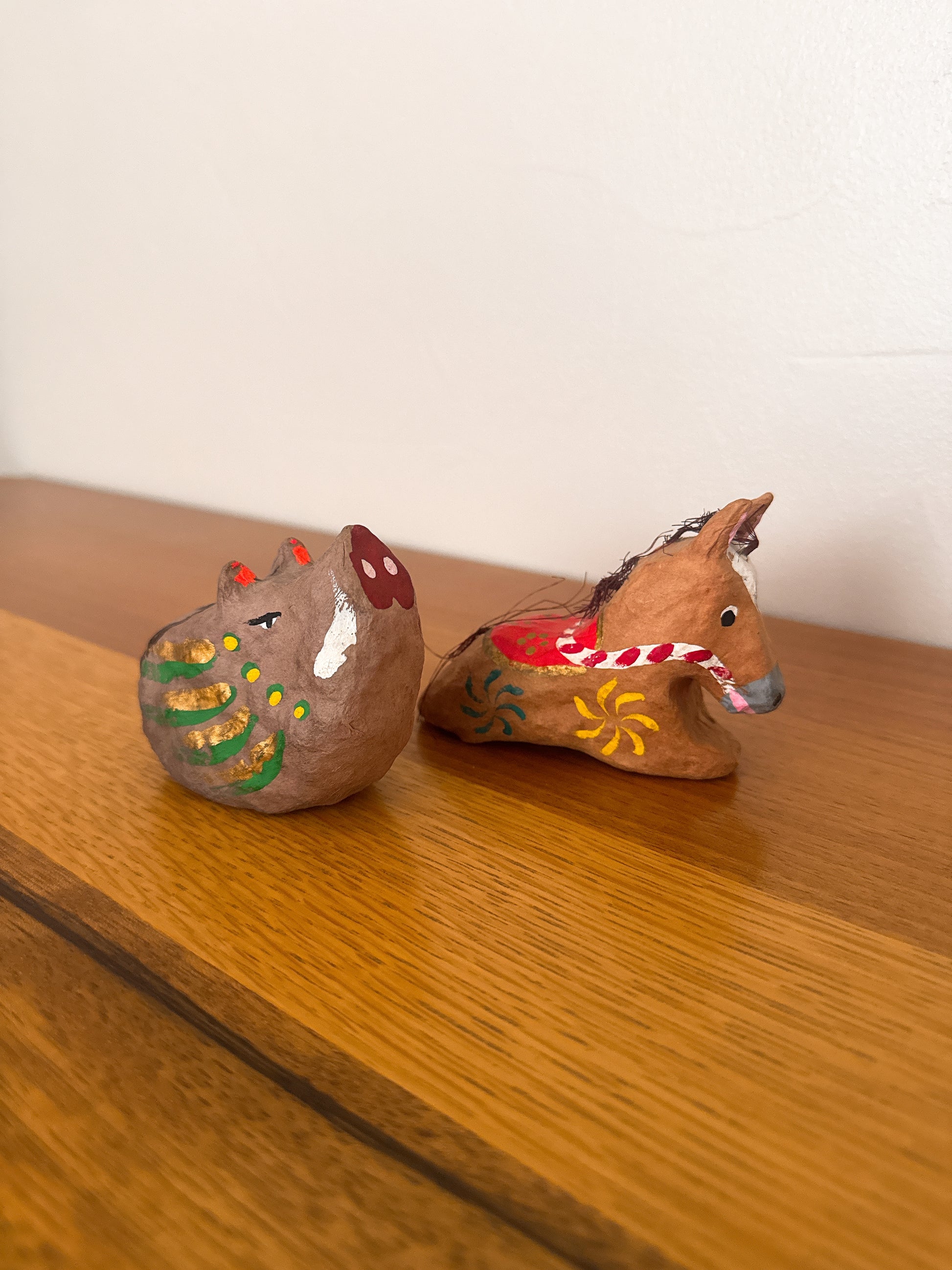 Ces charmantes figurines sont fabriquées à la main selon la technique traditionnelle du papier mâché appelée Gokayama Hariko, un artisanat populaire de la préfecture de Toyama. Le papier est mélangé à de la colle et travaillé comme de l’argile, puis minutieusement modelé et peint à la main par des artisans expérimentés.